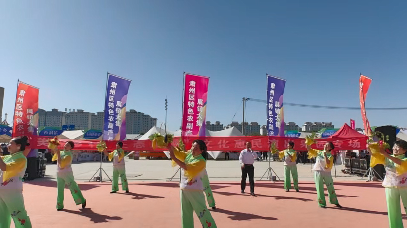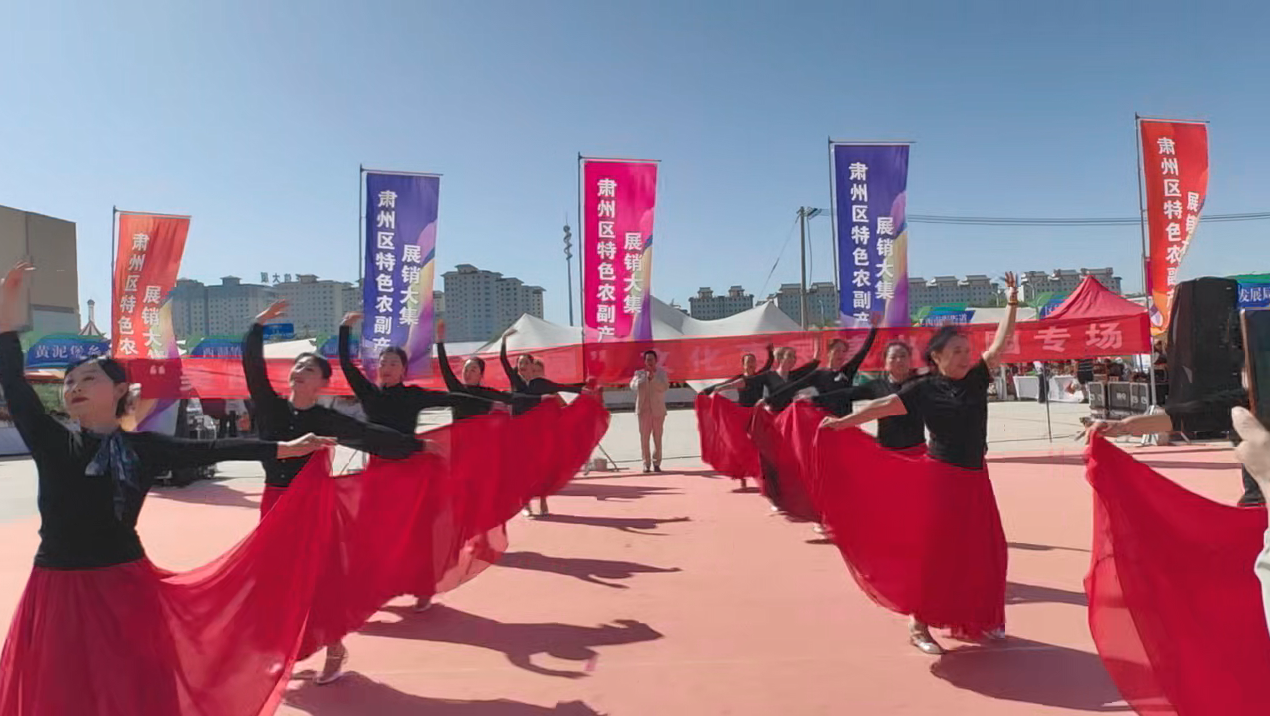 当日上午,展销会场地热闹非凡。酒泉职业技术大学社区教育中心老年合唱团精心编排了舞蹈、歌曲、情景剧等文艺节目,内容既融合了地方特色文化,又贴近乡村生活场景,引发现场观众的热烈共鸣。演出中,团队特别设计了互动环节,邀请当地农户分享种植故事、介绍产品特点,进一步拉近了文艺活动与助农主题的距离。